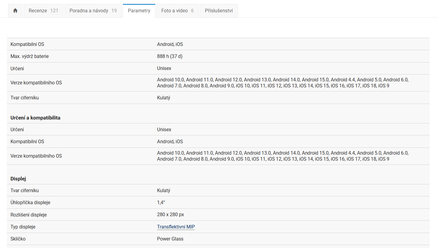 Popis vybraných parametrů chytrých hodinek Garmin na webu Alza.cz