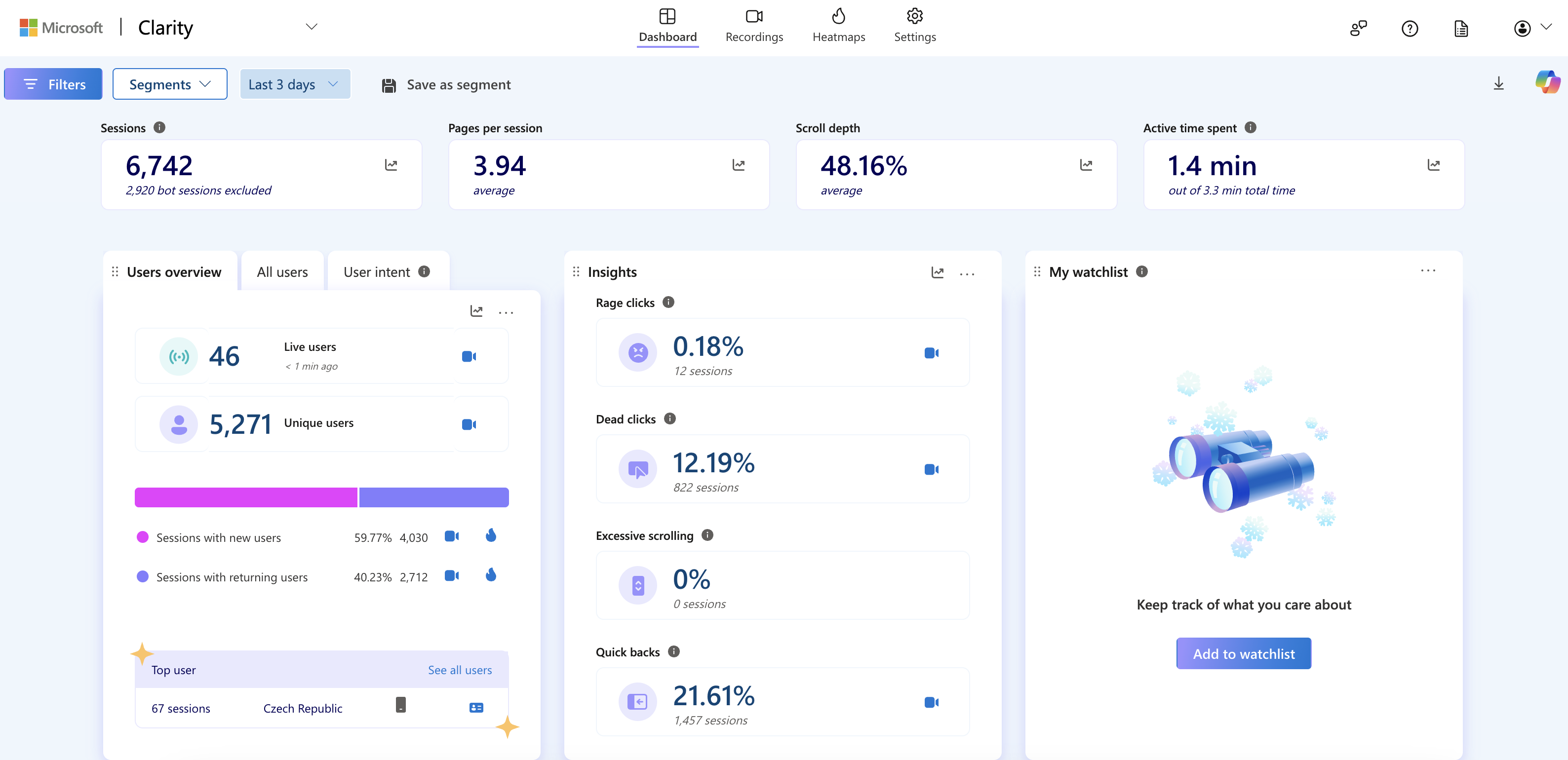 Měření má smysl, když z něj tvoříme statistiku, protože jednotlivé odchylky mohou být příliš významné v celkovém měřítku. Ideální je nastavit si pohled alespoň na 30 dní (defaultně jsou v Clarity nastavené pouze 3 dny).
