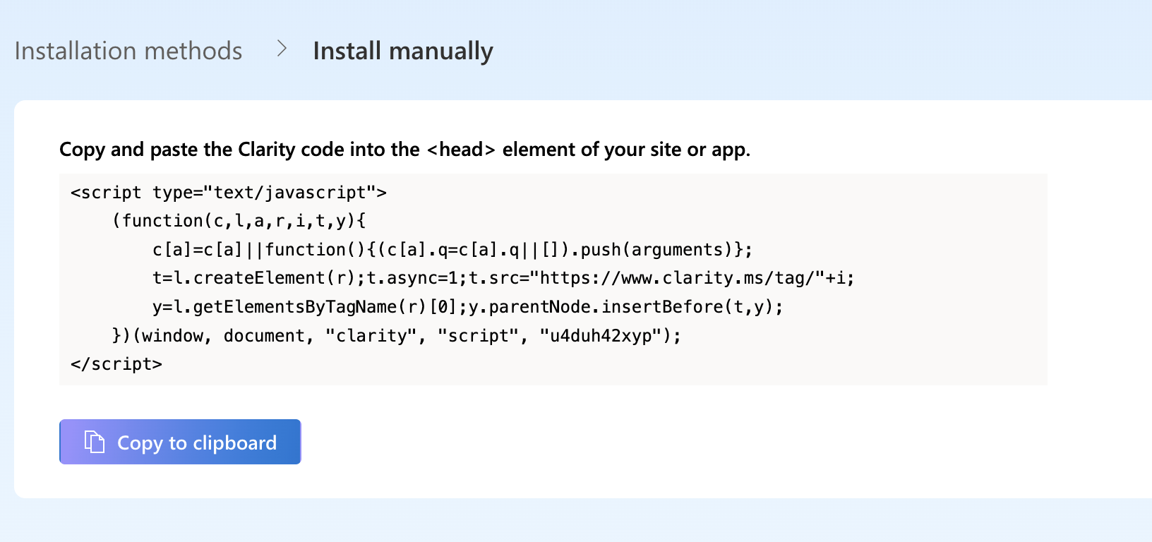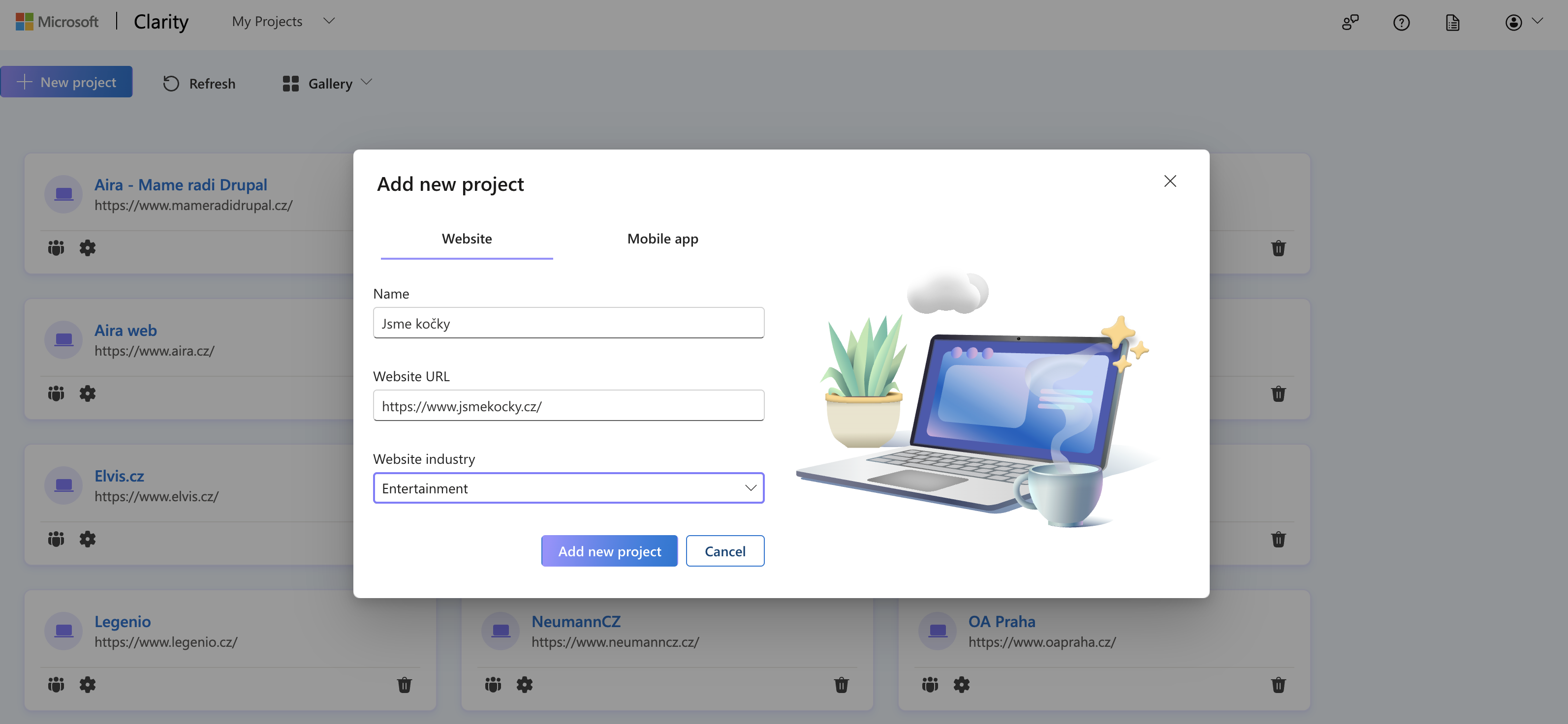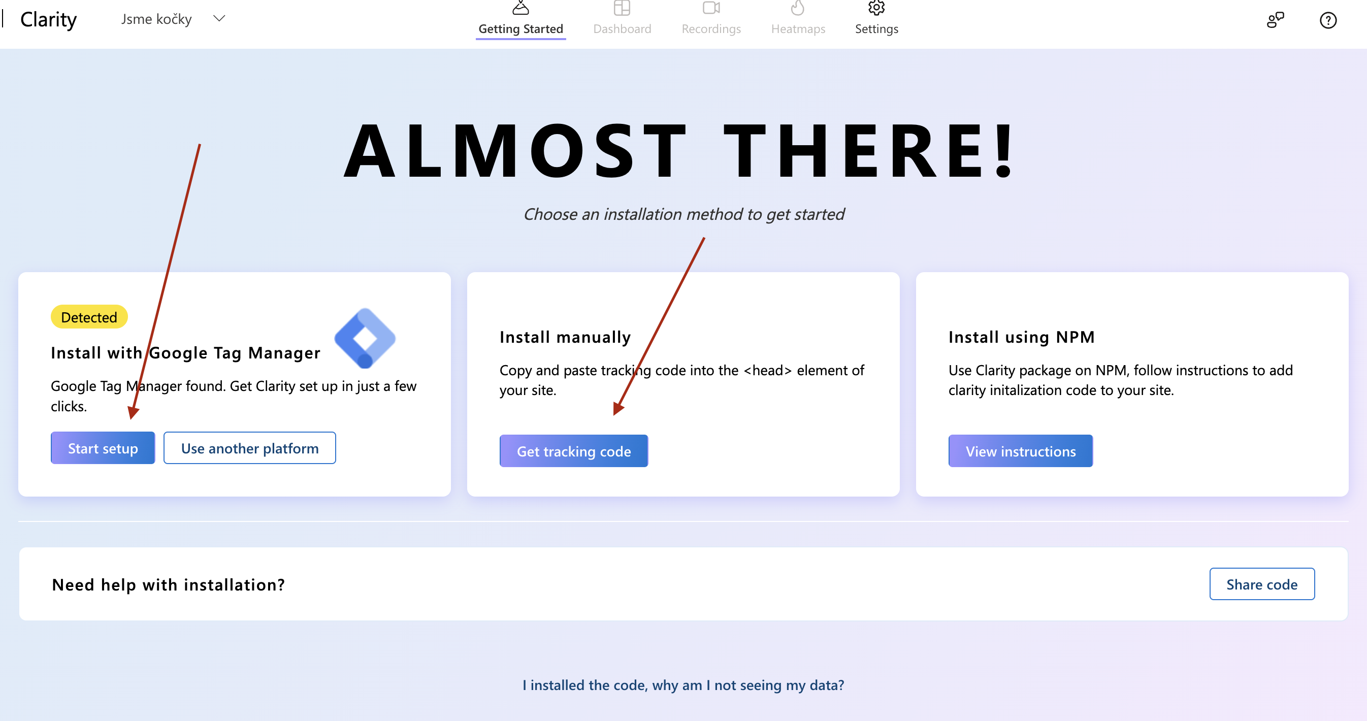 1. Založte projekt → clarity.microsoft.com → New project → název + URL → zkopírujte Project ID.