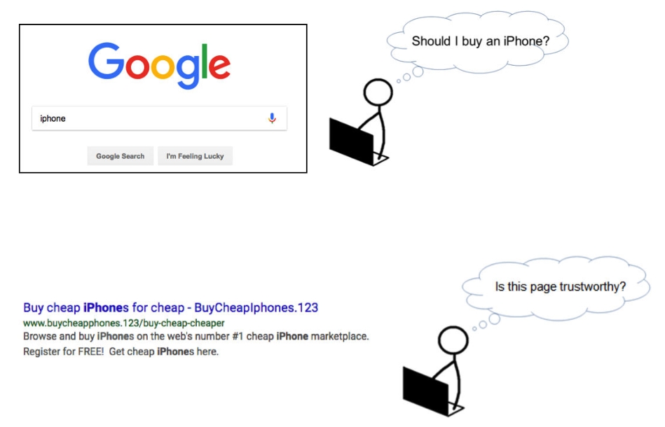 Níže uvádíme ilustrační obrázek z Pokynů pro hodnotitele kvality Vyhledávání, který znázorňuje chování uživatele při vyhledávání. Ten nejprve formuluje svůj záměr (koupě iPhonu). Poté se mu zobrazí výsledek, který v něm však vzbudí nedůvěru, protože v titulku odkazu se třikrát vyskytuje slovo „cheap“ („levný“). Hodnotitel by se měl při hodnocení vžít do role uživatele.
